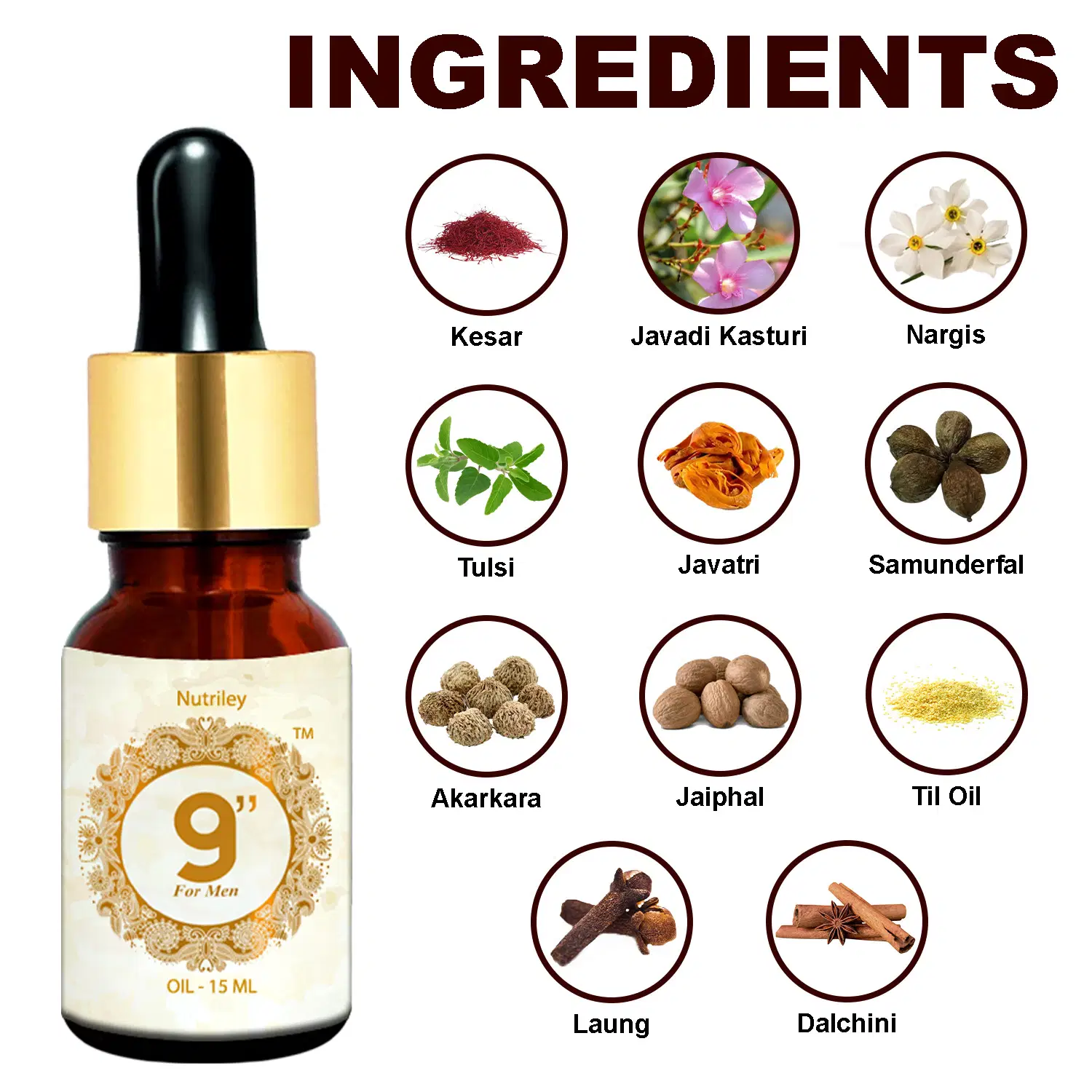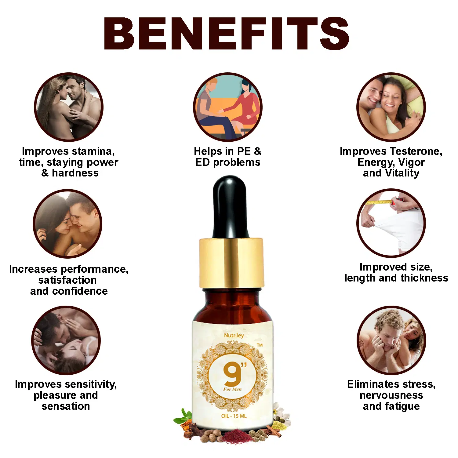 Nutriley 9 Inch Penis Enhancement Oil Formulated with Best Herbs to provide strength without side effect, gives you the confidence to impress your partner and satisfy her. Its unique formulation can increase blood flow, help release the male hormones. Massaging penis helps stretching tissues and multiplying it for fast growth. Oil effectively restores blood flow and stimulates production of hormones increase Libido, increases levels of nitric oxide from the nerve endings of muscles increasing stamina & various other exotic ingredients that have been known to help with male virility. Oil improve sexual health and strengthen function, also increase the blood flow into the organ, adds sensitivity and sensation, increases blood circulation.