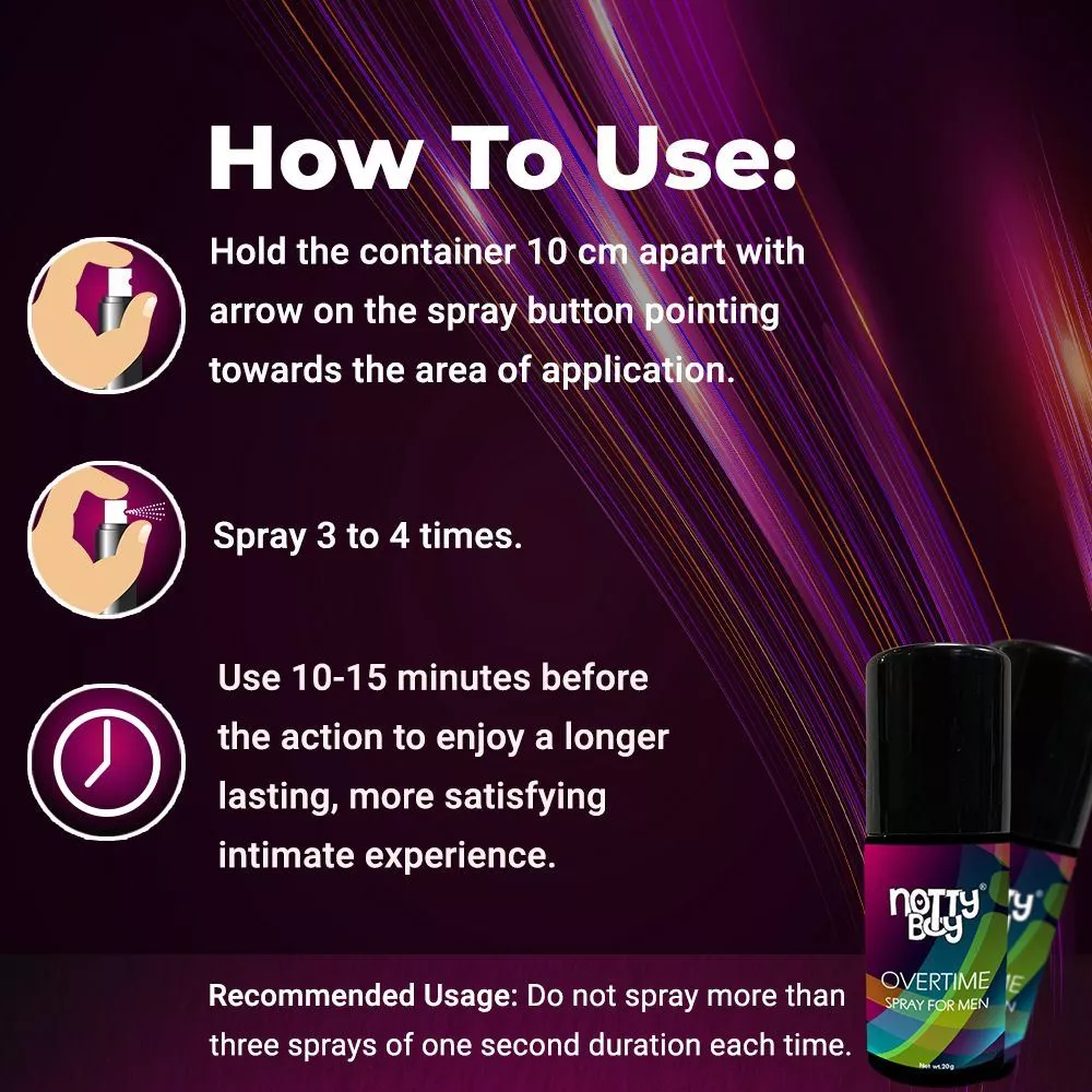 Let the good times roll in without looking at the clock. NottyBoy OVERTIME Spray is known to help men maintain longer erections. It is known as a stamina booster that may temporarily increase the time to ejaculation so you have more control and stay in the moment.