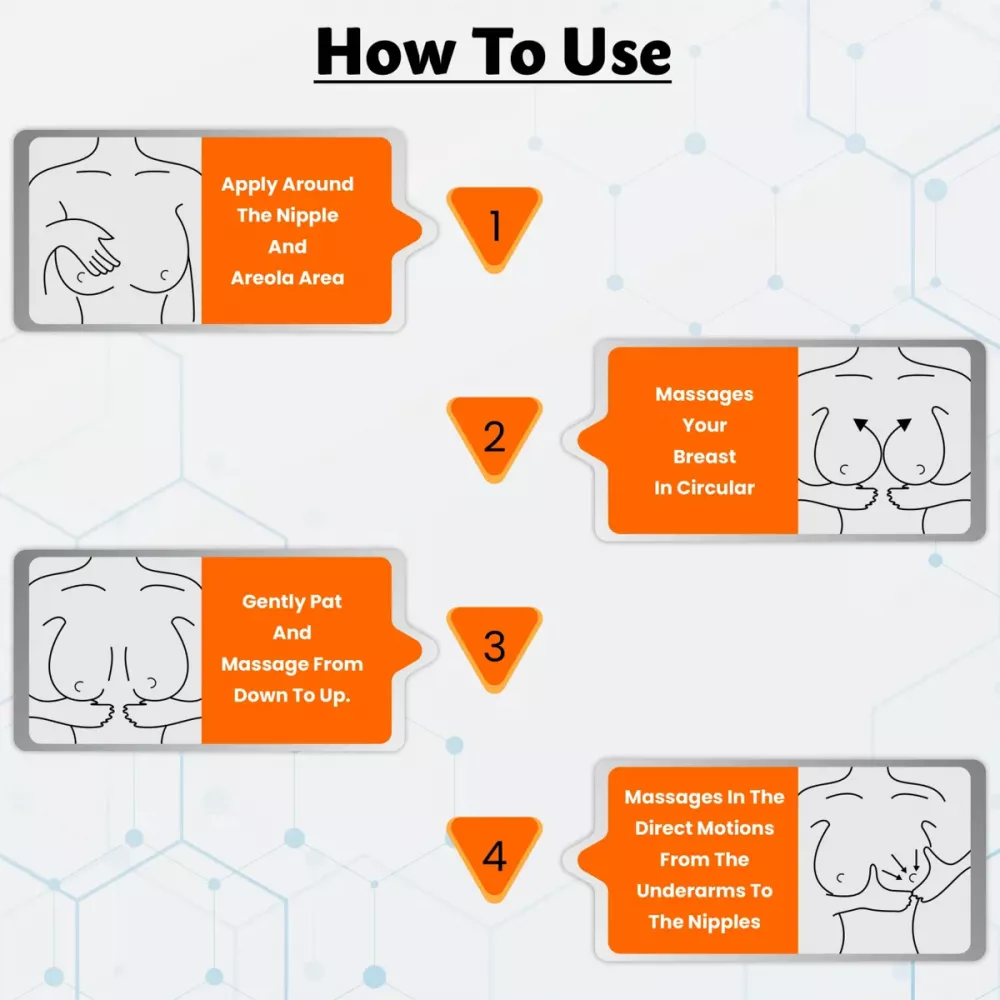 - Apply the cream around the breast lining and massage it for two to three minutes in an upward and outward motion